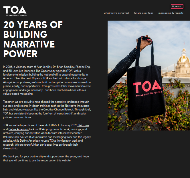 TOA trained hundreds of social justice leaders in values-based communication strategies and created spaces for culture change leaders to connect.In January 2026, ReFrame and Define American took on TOA’s programmatic work, trainings, and archives, carrying their narrative vision forward into its next chapter.