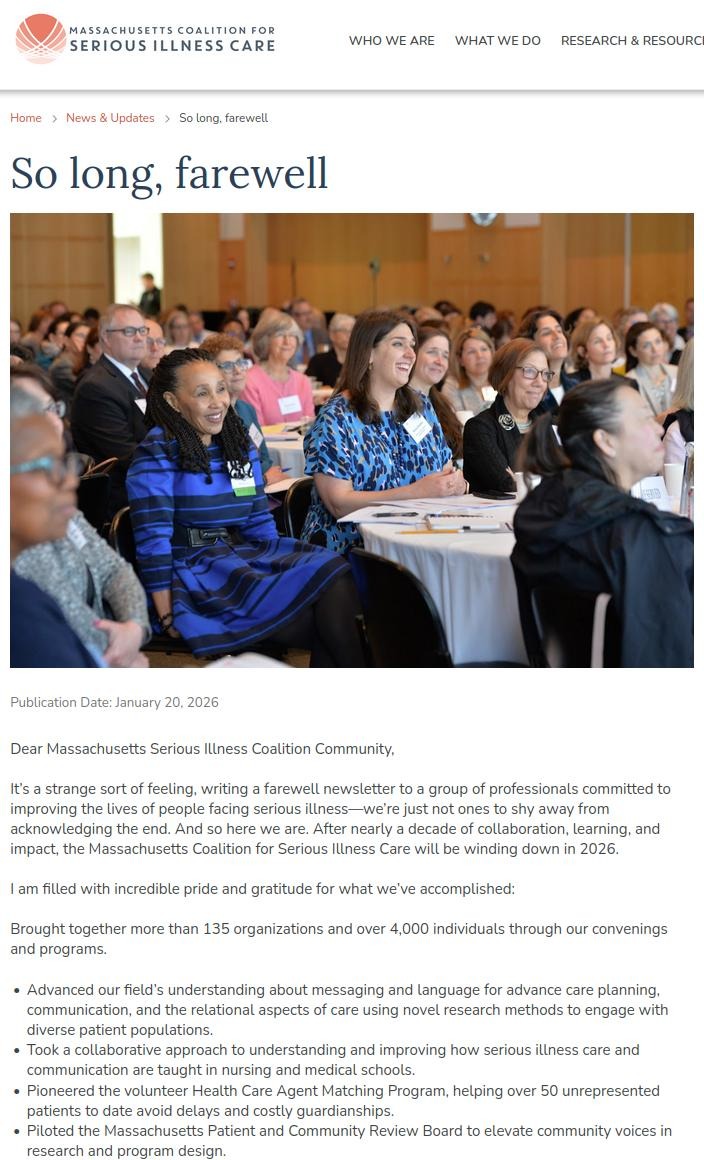 Chaired by acclaimed Dr. Atul Gawande, Massachusetts Coalition for Serious Illness Care formed in 2016 in response to the growing importance of end of life care, and the need for new strategies to encourage informed decision-making and advance planning.