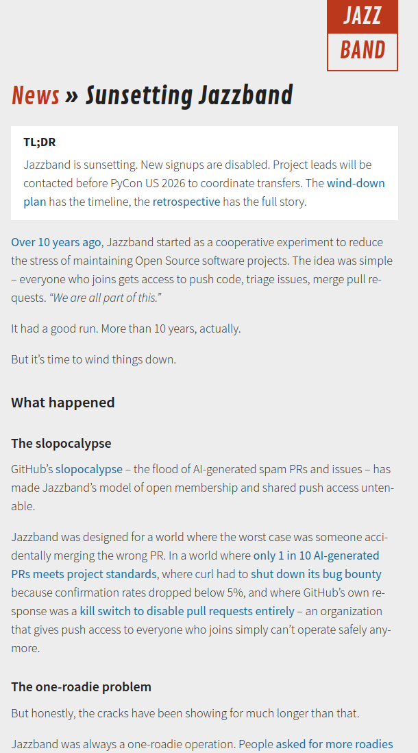 This platform was established to enable shared maintenance of small open source projects. An onslaught of AI spam and slop forced its closure.