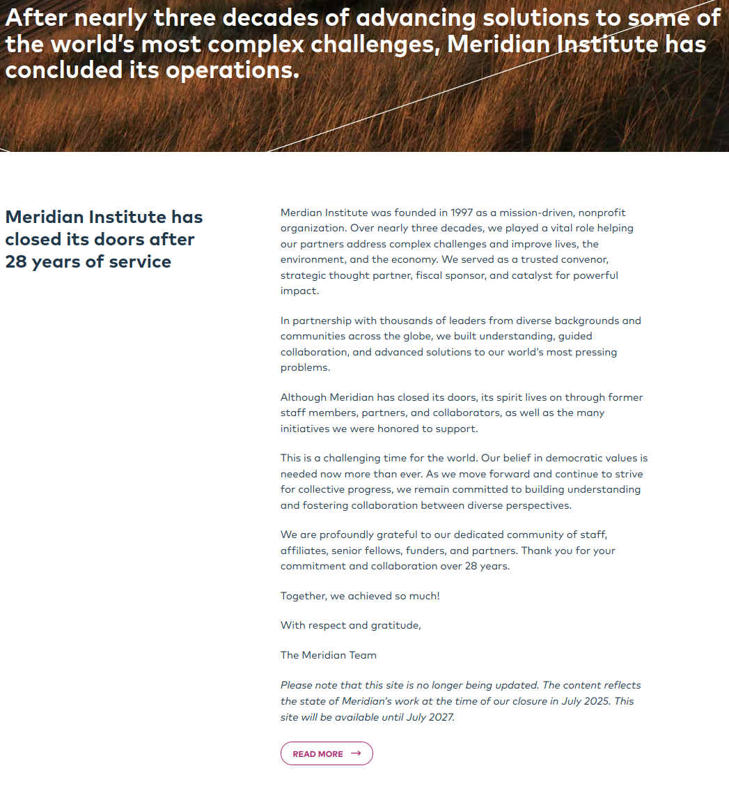 Over nearly three decades, Meridian played a vital role helping their partners address complex challenges and improve lives, the environment, and the economy. They served as trusted convenor, strategic thought partner, fiscal sponsor, and catalyst for powerful impact.